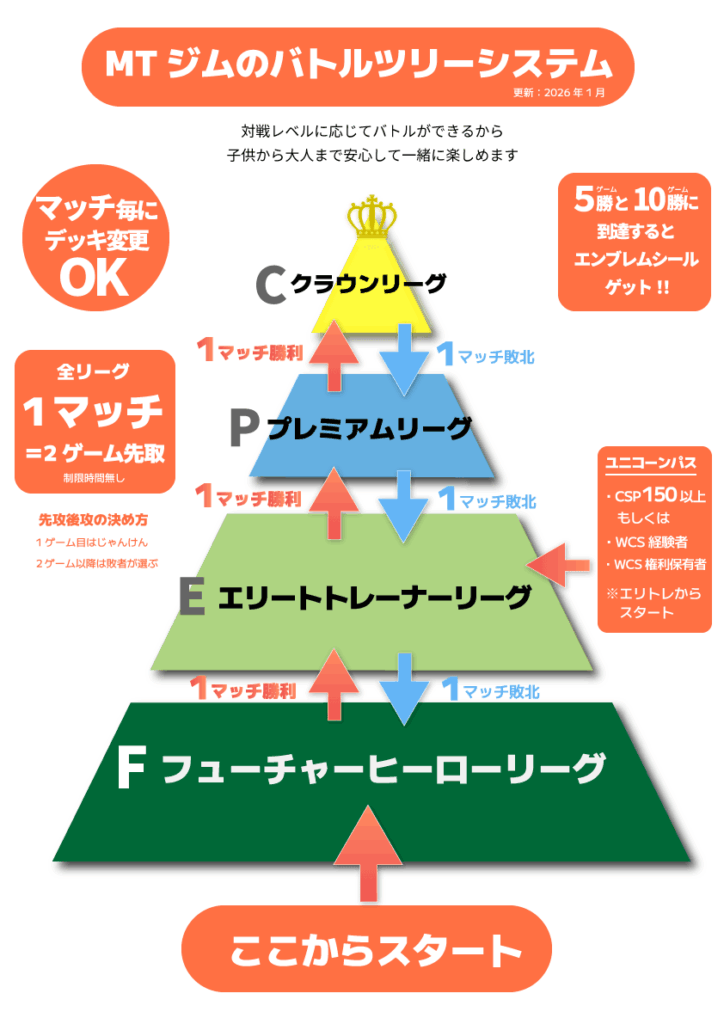 初心者から上級者まで、自分のレベルに応じたステージで昇格・降格を繰り返しながら、たくさんの対戦を通じてポケカの実力を高めていくポケカトレーナーのためのジムです。